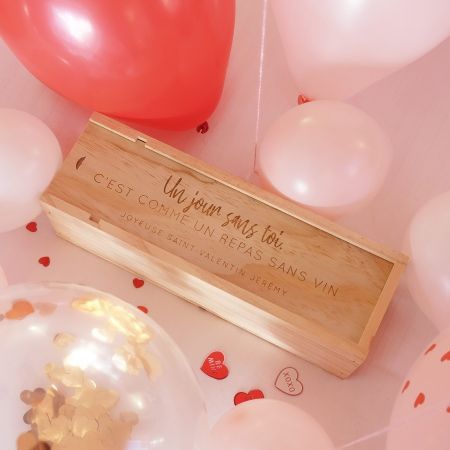 N'oubliez pas de sauvegarder votre personnalisation pour pouvoir l'ajouter au panierPour un cadeau de saint Valentin original et tendance, pour un anniversaire de rencontre ou de mariage ou tout simplement pour l'anniversaire de votre moitié, cette caisse à vin "un jour sans toi" personnalisable sera parfaite !