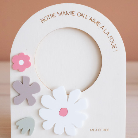Ce cadre photo est décoré de jolis motifs floraux en plexiglas coloré et des mots "Notre mamie, on l'aime à la folie !"