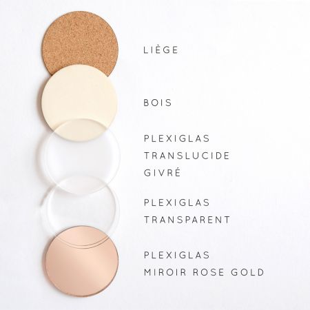 N'oubliez pas de sauvegarder votre personnalisation pour pouvoir l'ajouter au panierCes marque-places sont vendus à l'unité. Vous pouvez choisir la matière pour s'accorder au mieux avec votre décoration: bois, liège, ou plexiglas au choix (+1€): transparent brillant, translucide givré mat, ou miroir rose gold.