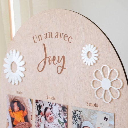 Des emplacements sont prévus pour accueillir les photos mensuelles de la première année de votre enfant, d'une taille maximale de 10x10 cm. Il est gravé "1 mois", "2 mois" etc.. jusqu'à "12 mois". Vous n'avez plus qu'à coller une photo sous chaque inscription.