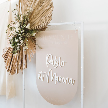 Il est subtilement gravé avec la phrase "Bienvenue au mariage de..." et une date et personnalisable avec les prénoms des mariés, collés en plexiglas blanc.