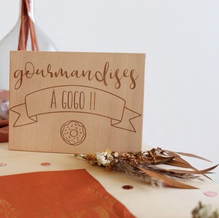 Son message gravé "Gourmandises à gogo", invitera vos convives à profiter du joli buffet que vous aurez mis en place pour eux. Avec son design tendance, il participera à la décoration de votre mariage, anniversaire ou jolie fête.