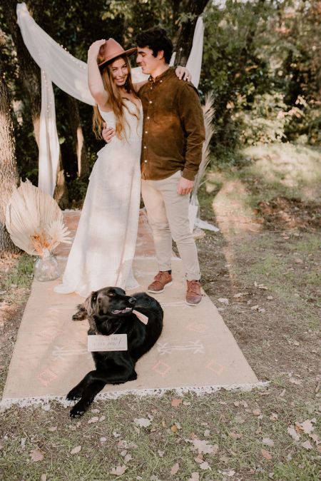 Cette pancarte est gravée "Moi aussi, je dis oui !" et personnalisable avec les prénoms des mariés, le nom du chien et la date du mariage.