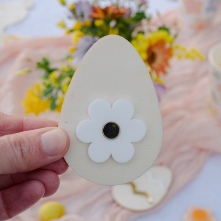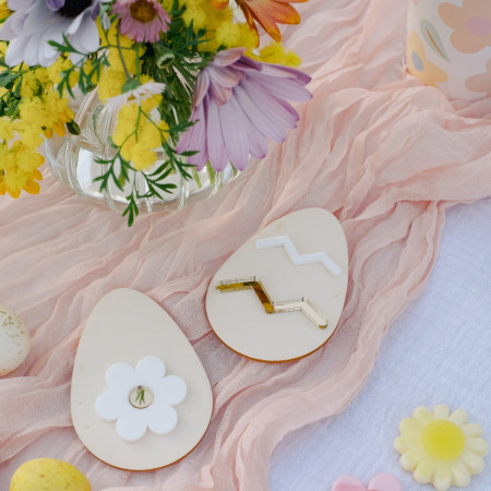 Ces œufs sont en bois et décorations en plexiglas blanches et miroir dorée.