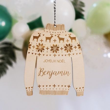 Cette décoration de sapin "pull-over kitsch" est personnalisable avec le prénom de votre choix !