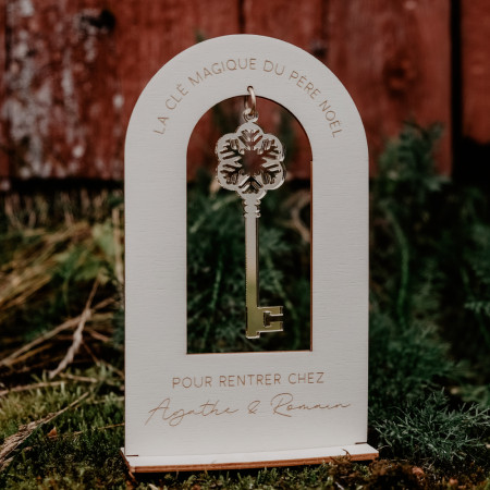 En forme d'arche en bois, elle est gravée avec le texte " La clé magique du Père Noël pour rentrer chez..." et personnalisable avec un ou plusieurs prénom(s).