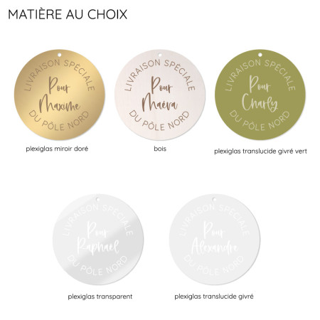 Cette étiquette cadeau est ronde et gravée avec le texte "livraison spéciale du Pôle Nord pour..." personnalisable avec un prénom.