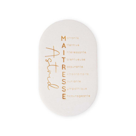- Maîtresse : chaque lettre du mot maîtresse est reprise pour former un adjectif "Marrante, Attentive, Intéressante, Talentueuse, Rassurante, Extraordinaire, Souriante, Sympathique, Encourageante" et le prénom de la maîtresse est gravé dans une jolie typo manuscrite.