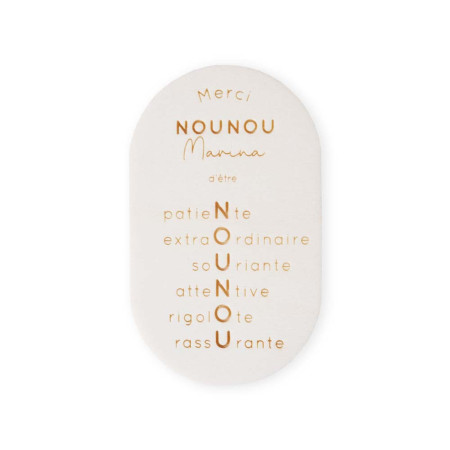 - NOUNOU : "Merci nounou d'être patiente, extraordinaire, souriante, attentive, rigolote, rassurante". L'aimant est personnalisable avec le prénom de la nounou.