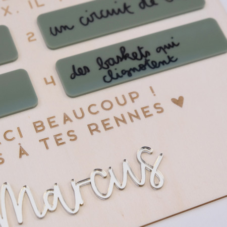 Elle est fabriquée en bois avec un message gravé et des cases en plexiglas permettant d'inscrire au stylo pour ardoise (non fourni) les réponses de votre enfant.