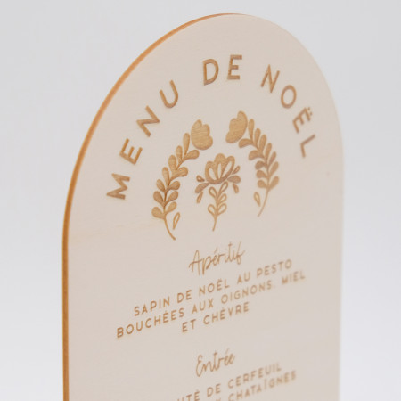N'oubliez pas de sauvegarder votre personnalisation pour pouvoir l'ajouter au panierCe joli menu de Noël en bois est gravé avec un motif de fleurs scandinaves, pour une décoration de table moderne et nordique !