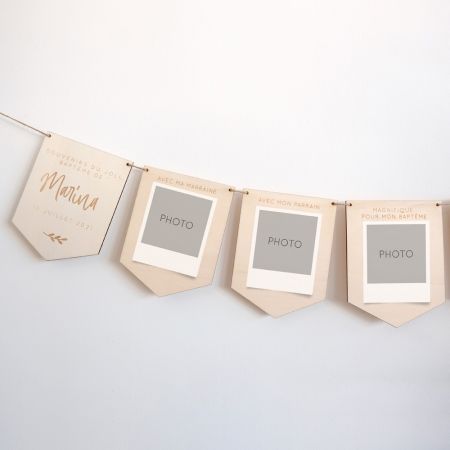 Sur les autres fanions sont gravés des titres ("Avec ma marraine", "Avec mon parrain", "Magnifique pour mon baptême", "Avec mes parents", "la cérémonie", et "toute la famille réunie")