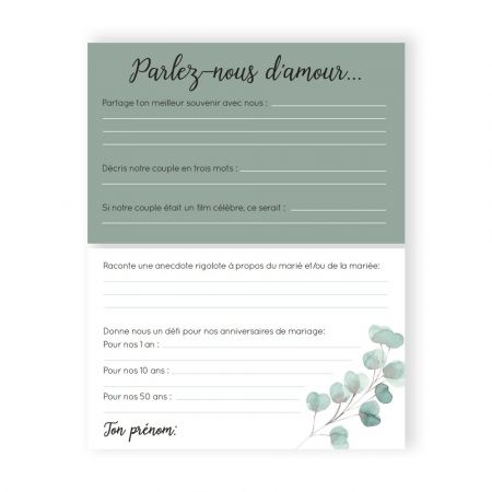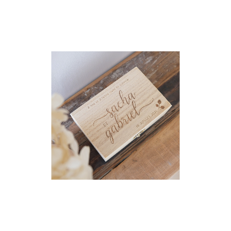Il est composé d'une boîte en bois personnalisable avec les prénoms des mariés et la date du mariage ainsi que d'un lot de 25 cartes recto/verso à remplir par les convives.