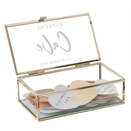 N'oubliez pas de sauvegarder votre personnalisation pour pouvoir l'ajouter au panierCette belle boîte en verre et métal doré effet vieilli est une alternative originale au livre d'or classique!