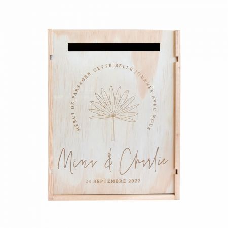 Cette urne dispose d'un couvercle à glissière, elle est personnalisée avec une jolie gravure, une fente sur le dessus permettra à vos convives de glisser de jolies enveloppes à l'intérieur de la boite.