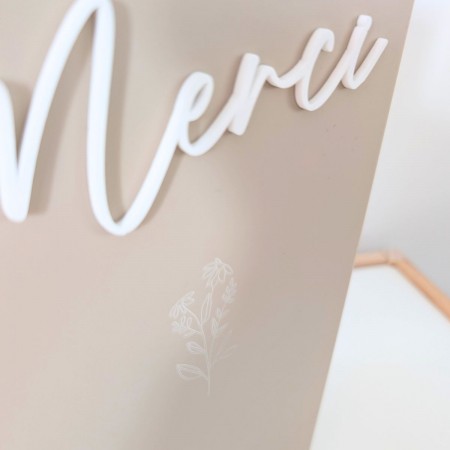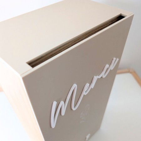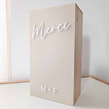 N'oubliez pas de sauvegarder votre personnalisation pour pouvoir l'ajouter au panierCette urne de mariage personnalisée séduit par son design minimaliste et très tendance. Sa façade en plexiglas mat couleur sable met en valeur un élégant lettrage « Merci » en plexiglas blanc en relief, apportant une touche douce et contemporaine à votre décoration de réception. Au centre de la façade, un délicat motif floral est gravé directement dans le plexiglas, ajoutant une finition subtile et raffinée qui rappelle l’univers du mariage et des fleurs.