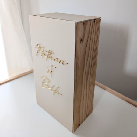 N'oubliez pas de sauvegarder votre personnalisation pour pouvoir l'ajouter au panierCette urne de mariage personnalisée en bois et plexiglas est une pièce à la fois décorative et fonctionnelle, pensée pour sublimer votre réception tout en recueillant les enveloppes et petits mots laissés par vos invités. Son design minimaliste et très tendance associe la chaleur du bois naturel à l’élégance d’une façade en plexiglas mat pour créer un objet décoratif qui s’intègre parfaitement dans de nombreux univers de mariage : bohème, champêtre, moderne ou romantique.